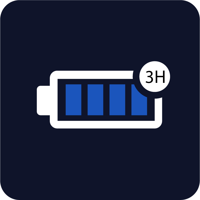 3+ hours per charge, swappable battery for non-stop use.